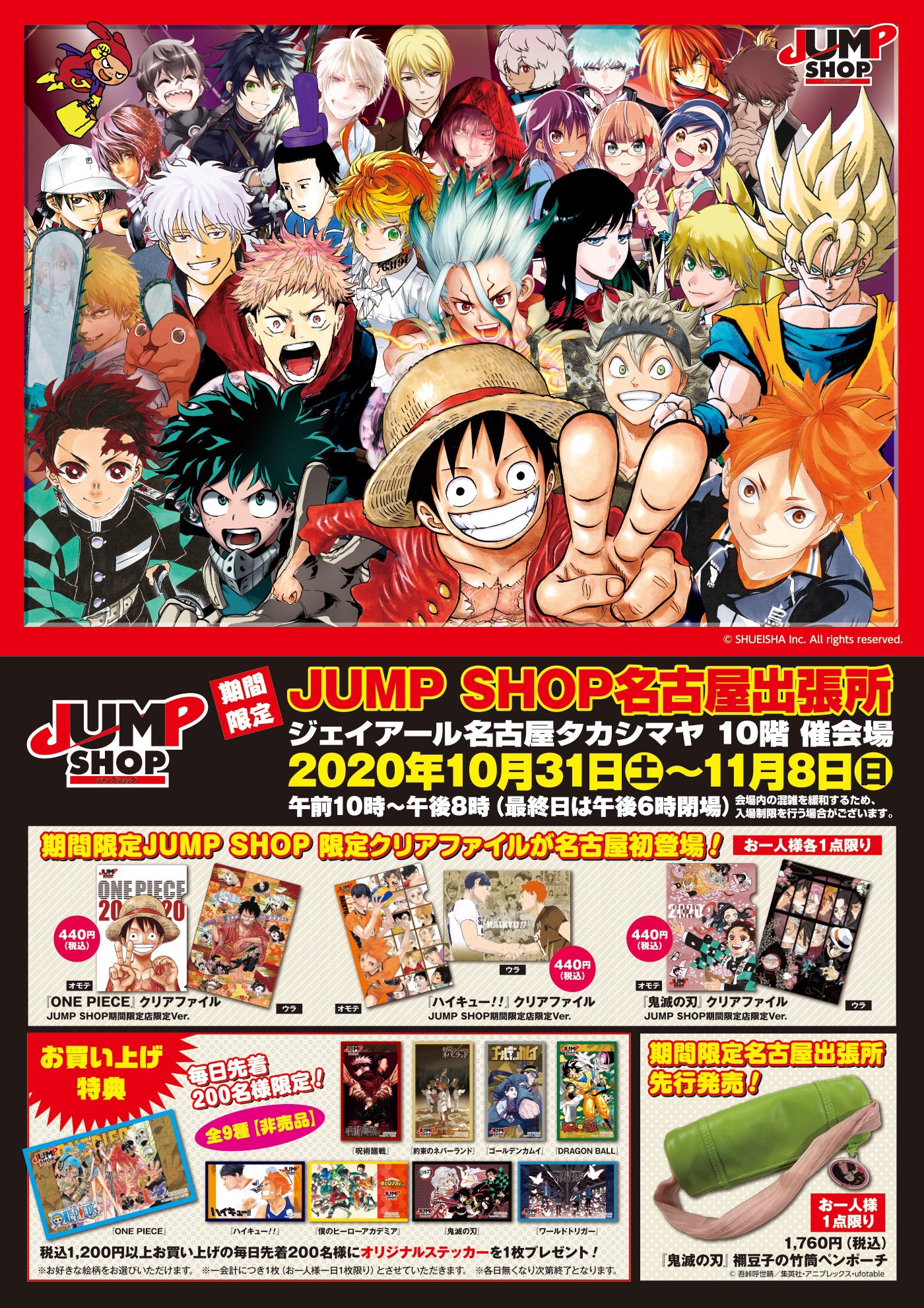 ジャンプショップ Jump Shop 公式 期間限定店舗情報 Jump Shop名古屋出張所 ジェイアール名古屋タカシマヤ 10階 催会場にて 絶好調開催中 期間限定店限定クリアファイル One Piece ハイキュー 鬼滅の刃 が名古屋初登場 11月8日